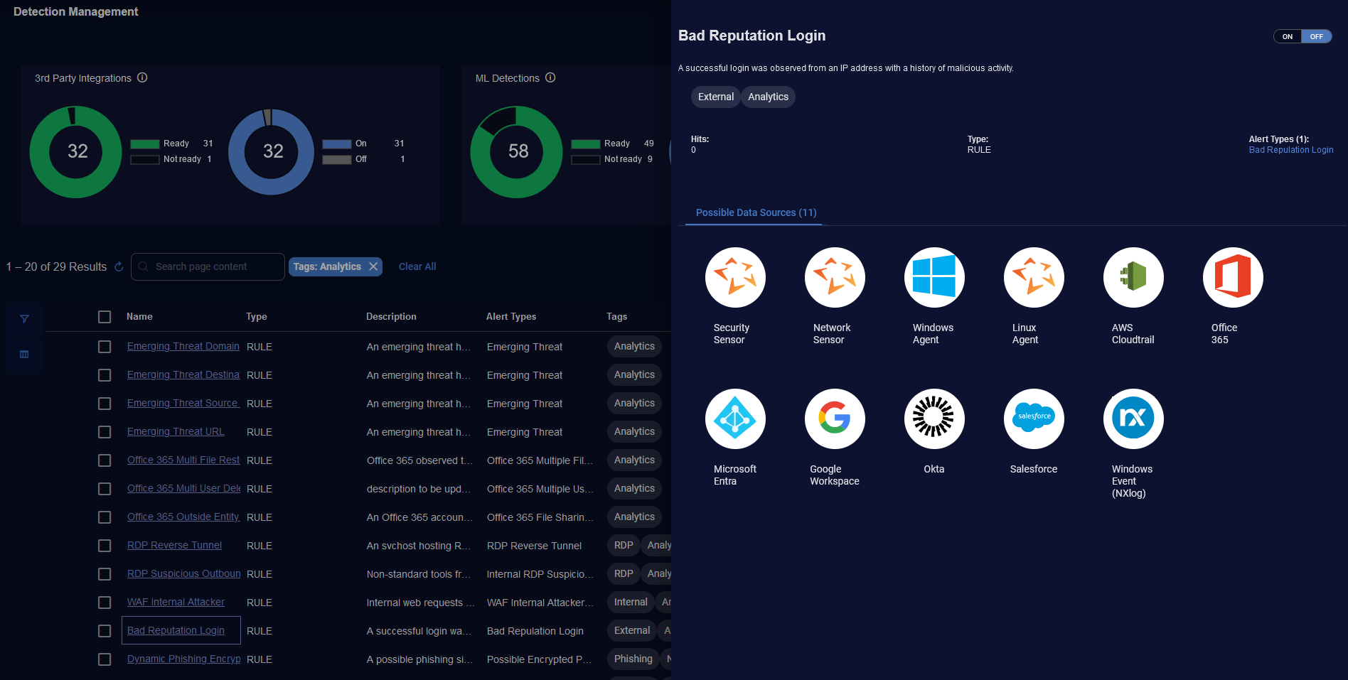 Tags—Tags that identify the detection such as External, Internal, Analytics, Sigma, or Malware.
