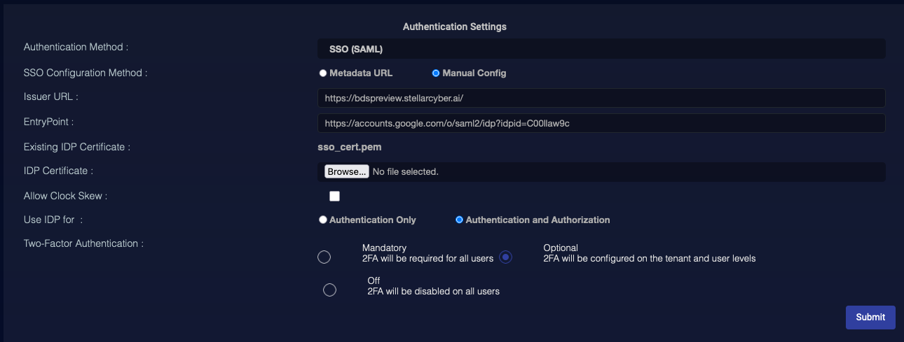 Stellar Cyber supports several IdPs using SAML 2.0. Stellar Cyber supports use of an IdP for Authentication as well as Authentication and Authorization.