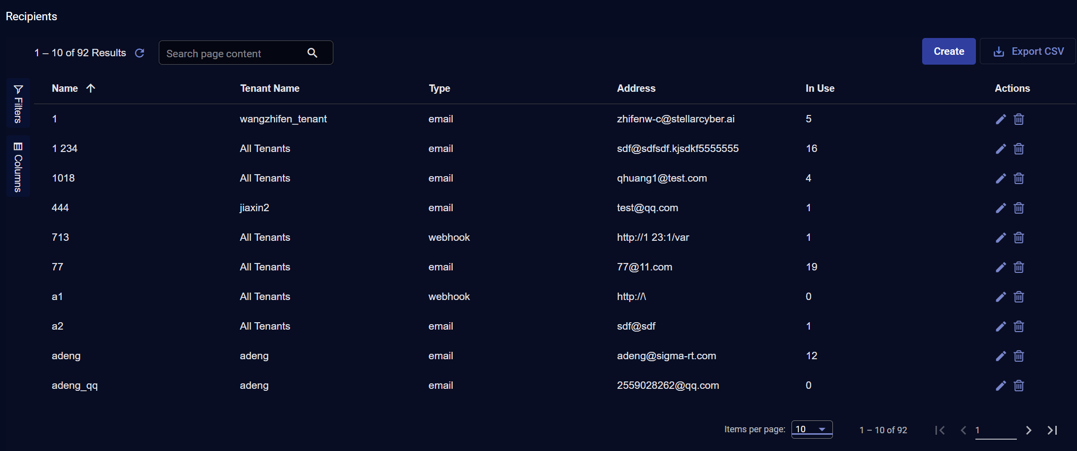 When you click System | Configuration | Recipients, Stellar Cyber displays a table listing all currently configured Recipients, as in the example below.