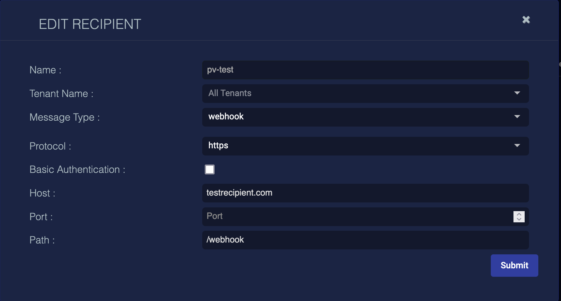• If you enable Basic Authentication, additional fields for a Username and Password appear. The password is masked as you enter it and is not shown in the summary table of configured recipients.