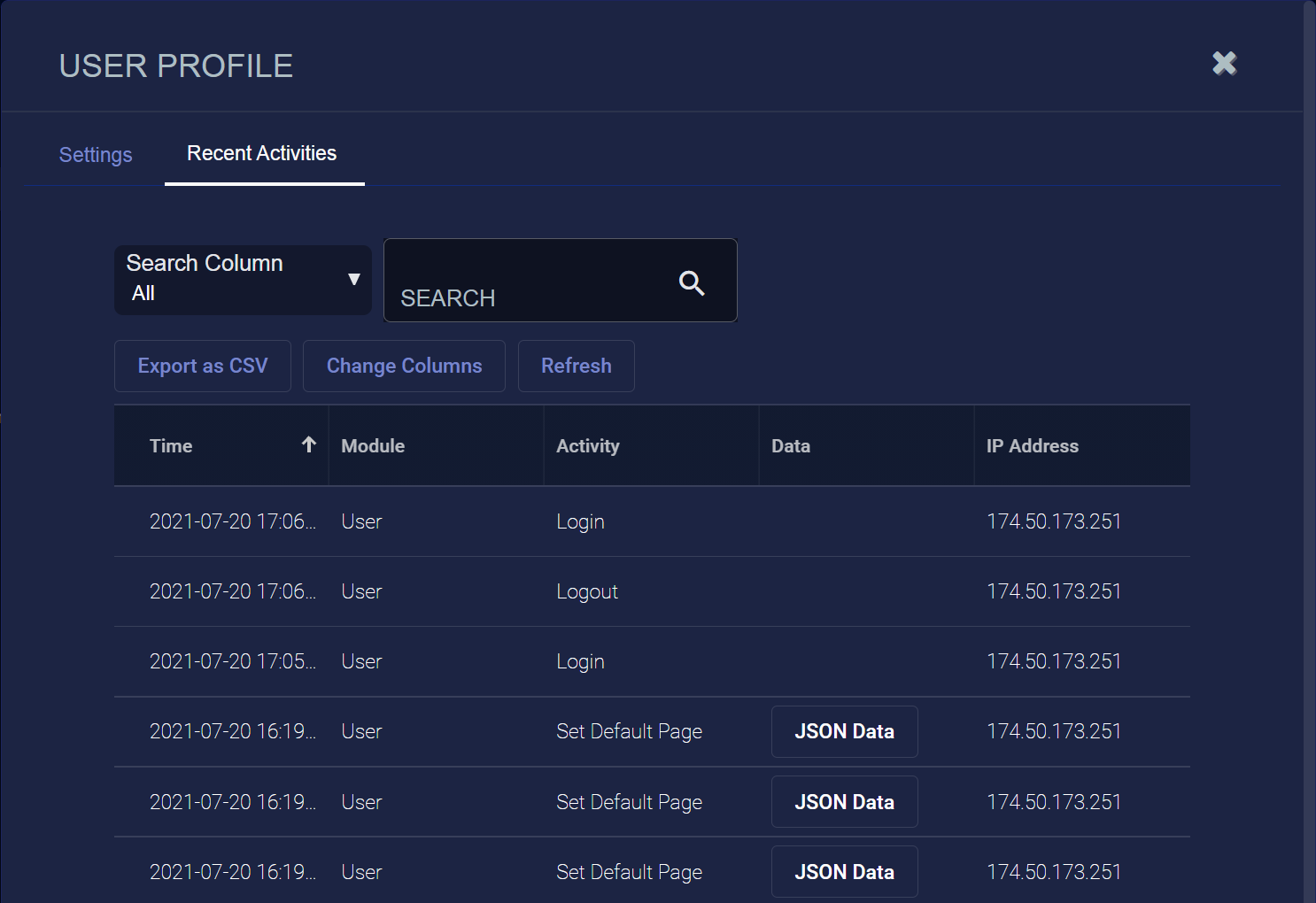 To see the JSON data, which is shown when you make user configuration changes, click the JSON Data button in the Data column. Logging in or out does not generate JSON data.
