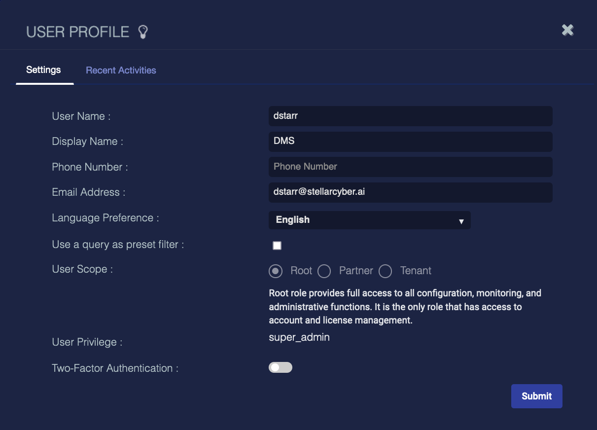 In the dialog that displays, you can manage your profile, customize aspects of the Stellar Cyber user interface, and see your recent activities.
