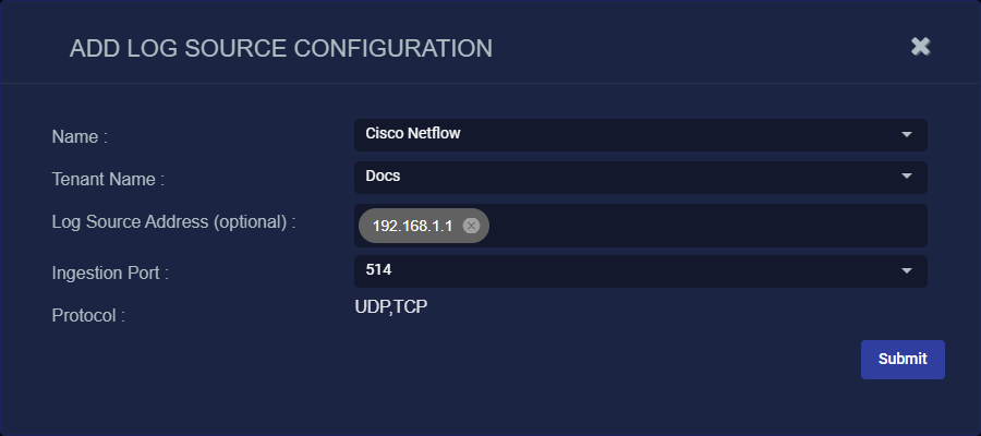 6. Use the Ingestion Port dropdown to specify whether this entry is for logs arriving on the standard syslog port of 514, the secure syslog port of 6514, or the secure HTTP port of 443.