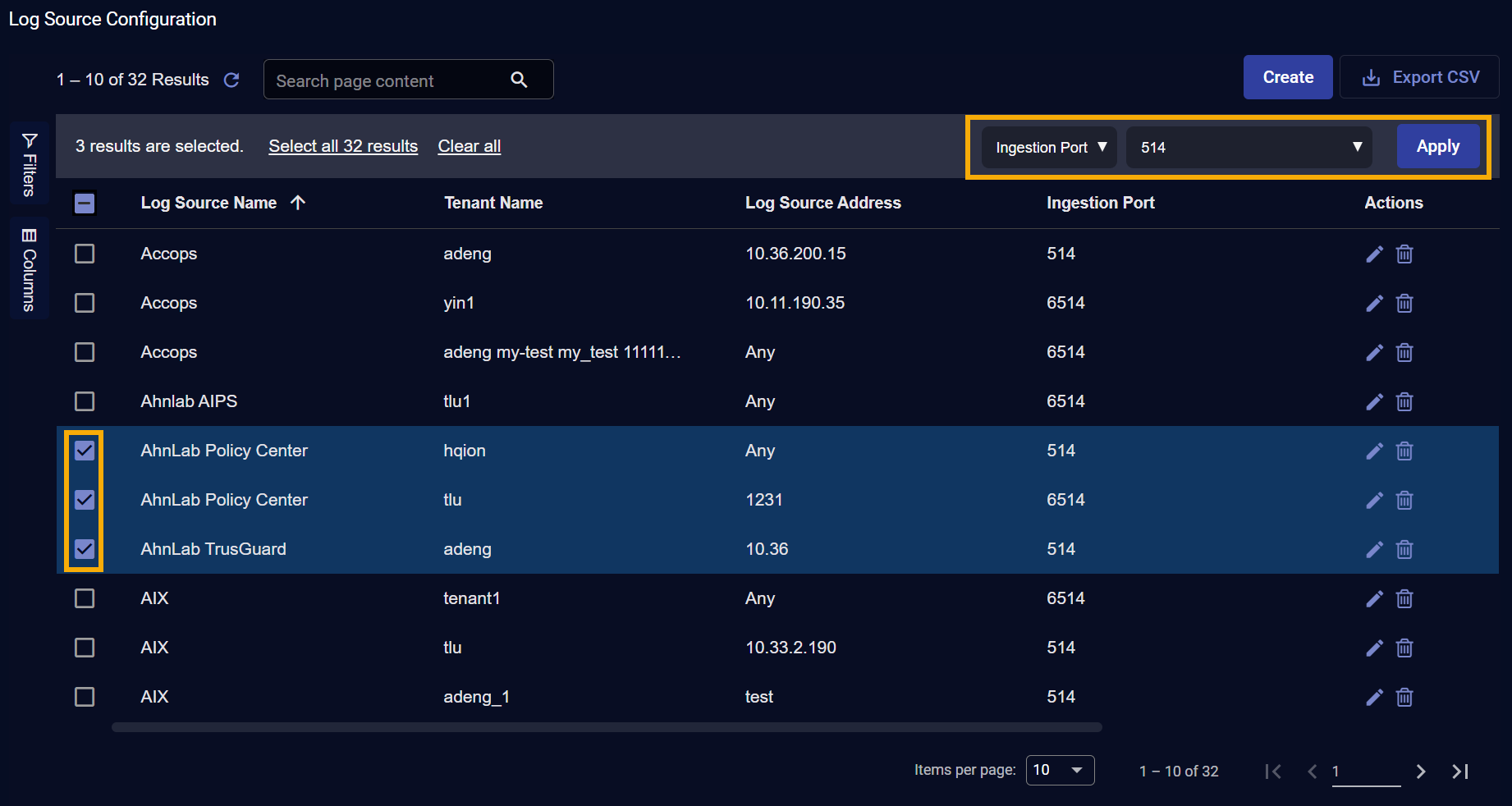 • You can also perform bulk edits of the ingestion port for different log sources by checking their boxes in the list and then using the Ingestion Port dropdowns and Apply button at the top of the list.