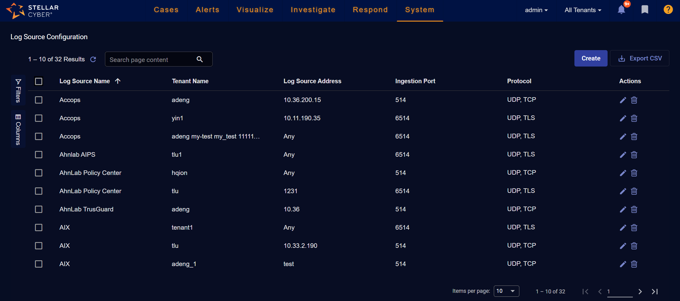 • The Log Source page supports standard Stellar Cyber table functionality, including edit and delete capabilities.