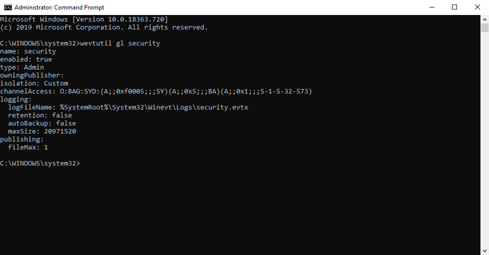 5. Run the wevtutil gl security command again. The channelAccess string should now match the new string.