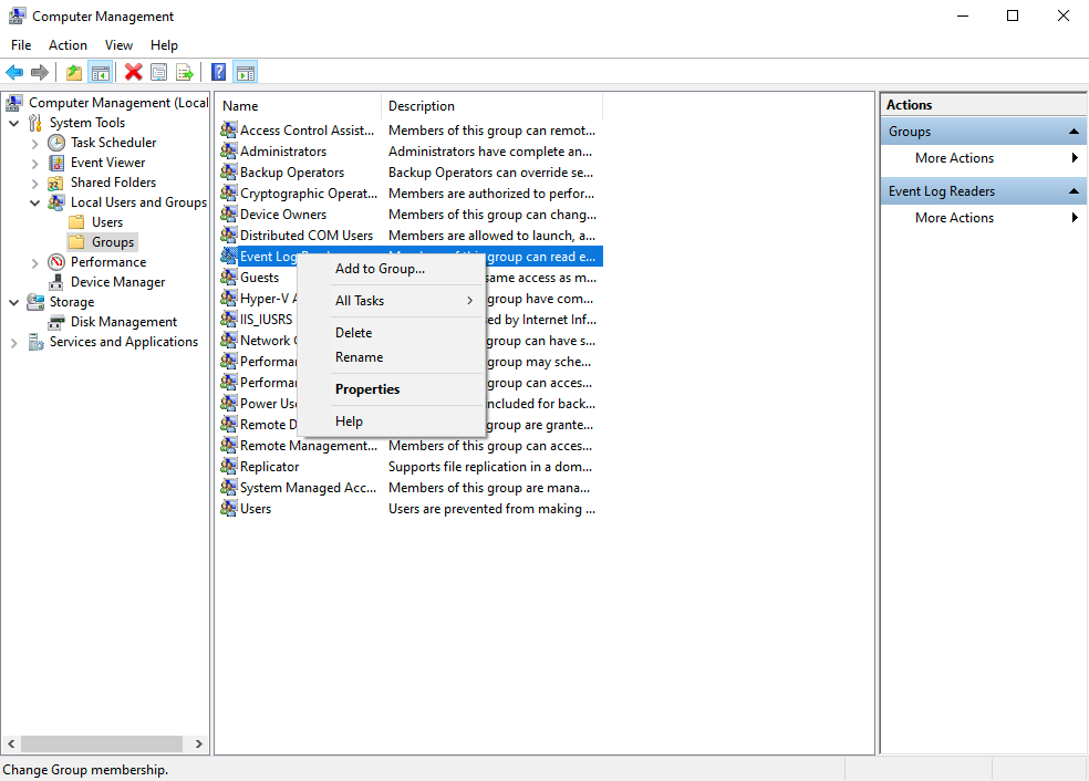 5. Click on Add to Group.... The Event Log Readers Properties dialog box appears.