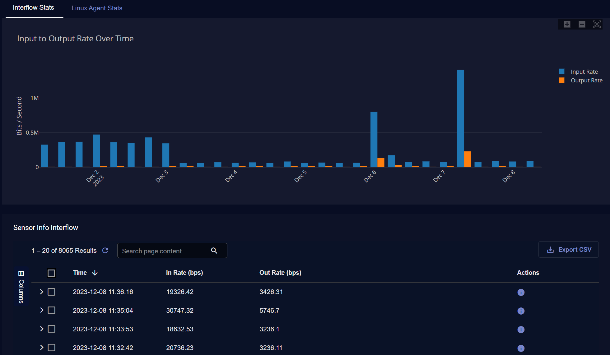 The Interflow Stats tab shows the rate of Interflow input and output over the time interval selected using the standard filter controls at the top of the page. Separatebars quantify the input and output rates for the sensor.