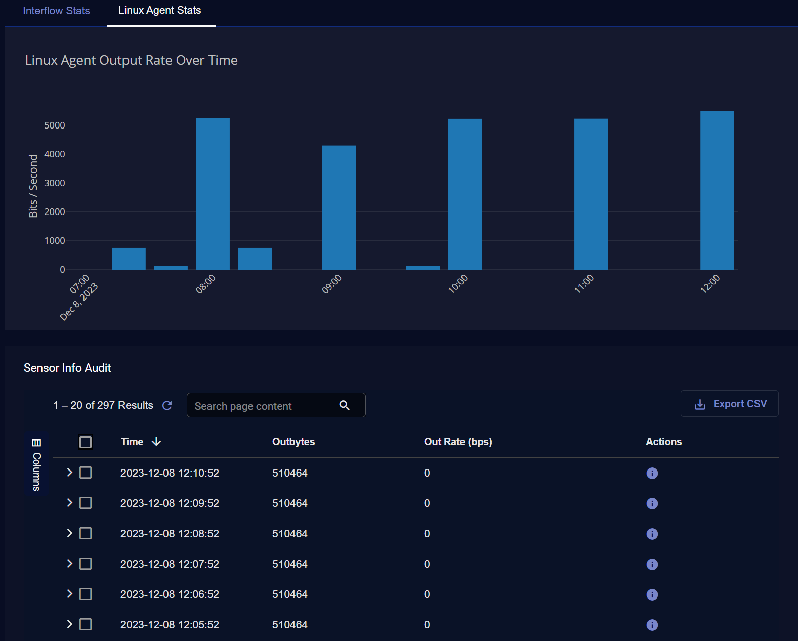 When the Linux Agent Stats tab is displayed, you can also see the Sensor Info Audit table below the graph. This table provides separate entries with metadata for the one-minute buckets of logs sent by the Linux Server Sensor.