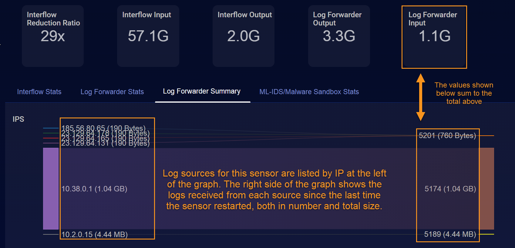The Log Forwarder Summary tab shows a historical record of logs received since the last time the sensor was restarted, broken out by IP address of the different log sources. For example, in the figure below, you can see the relative quantity of logs contributed by each of six separate sources, both in quantity and total size. Note that the total size of all logs received sums to the total shown in the Log Forwarder Input block in the Input/Output Panel above the graph.