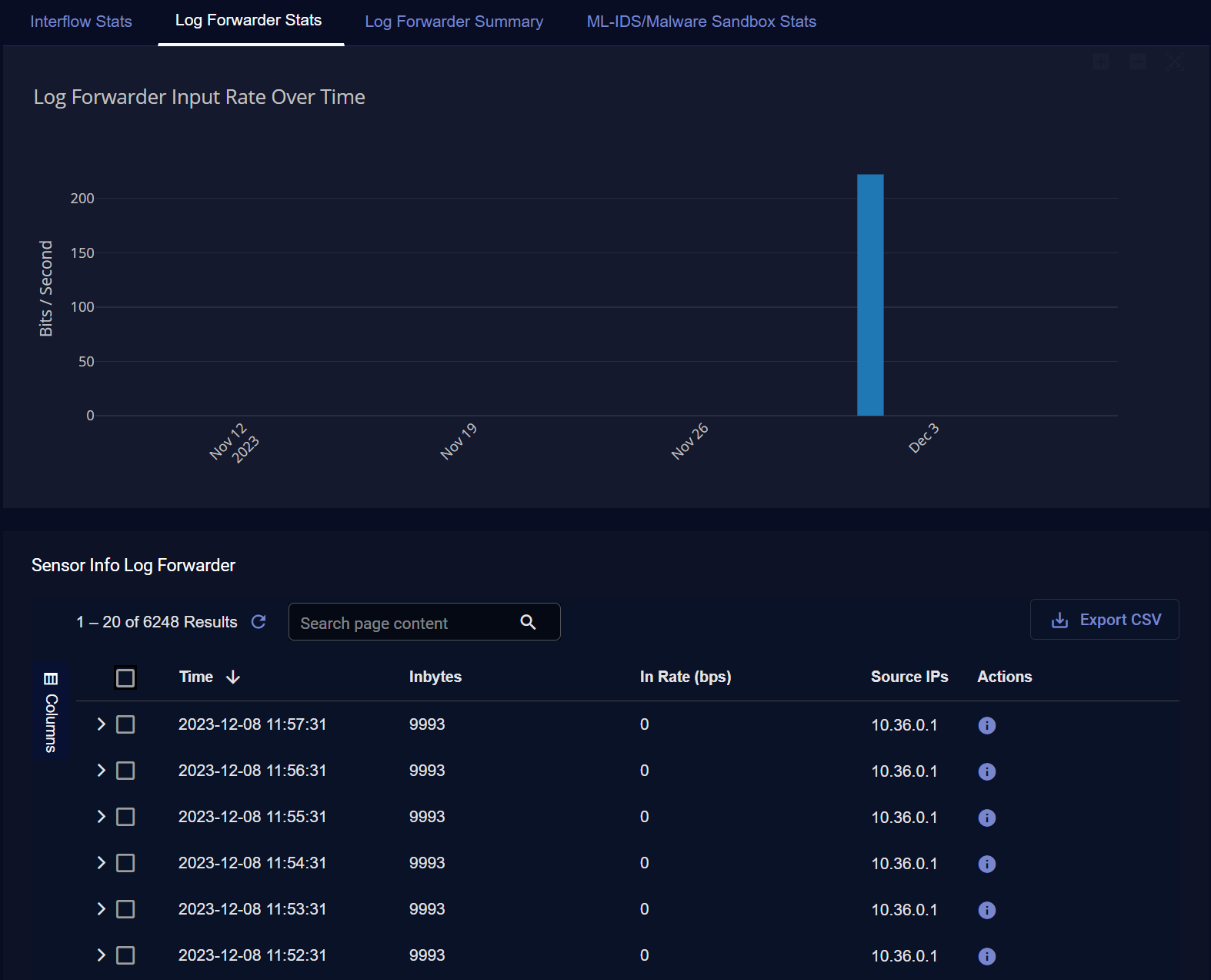 When the Log Forwarder Stats tab is displayed, you can also see the Sensor Info Log Forwarder table below the graph. This table provides separate entries with metadata for the one-minute buckets of logs received by the sensor from each log source.