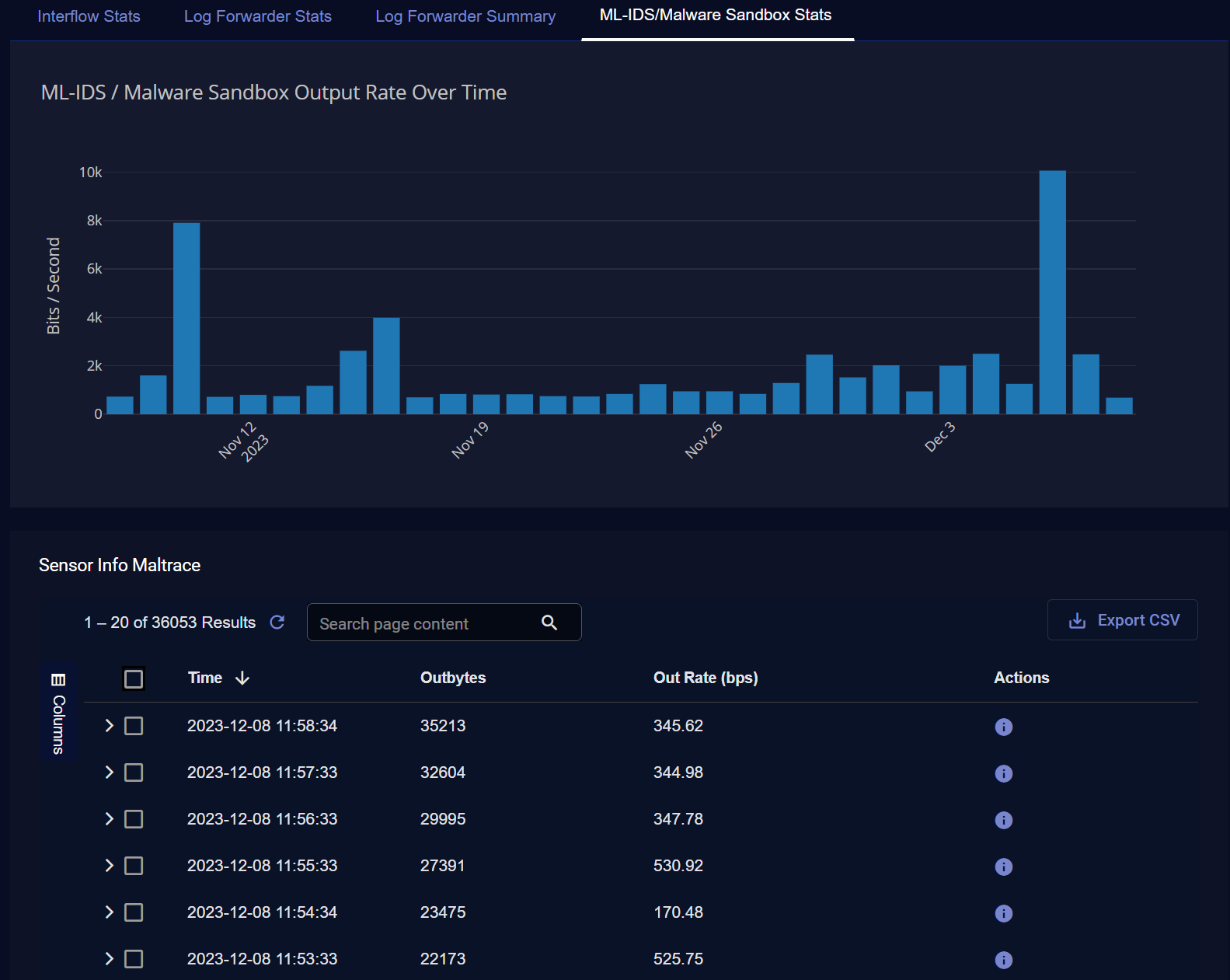 When the IDPS/Malware Sandbox Events Stats tab is displayed, you can also see the Sensor Info Maltrace table below the graph. This table provides separate entries with metadata for the one-minute buckets of maltrace data sent by the sensor.