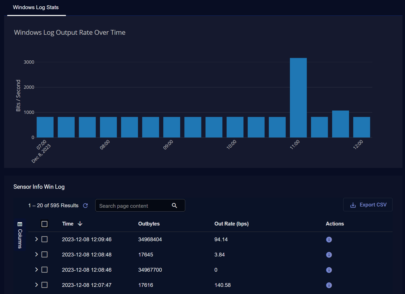When the Windows Log Stats tab is displayed, you can also see the Sensor Info Win Log table below the graph. This table provides separate entries with metadata for the one-minute buckets of logs sent by the Windows Server Sensor.