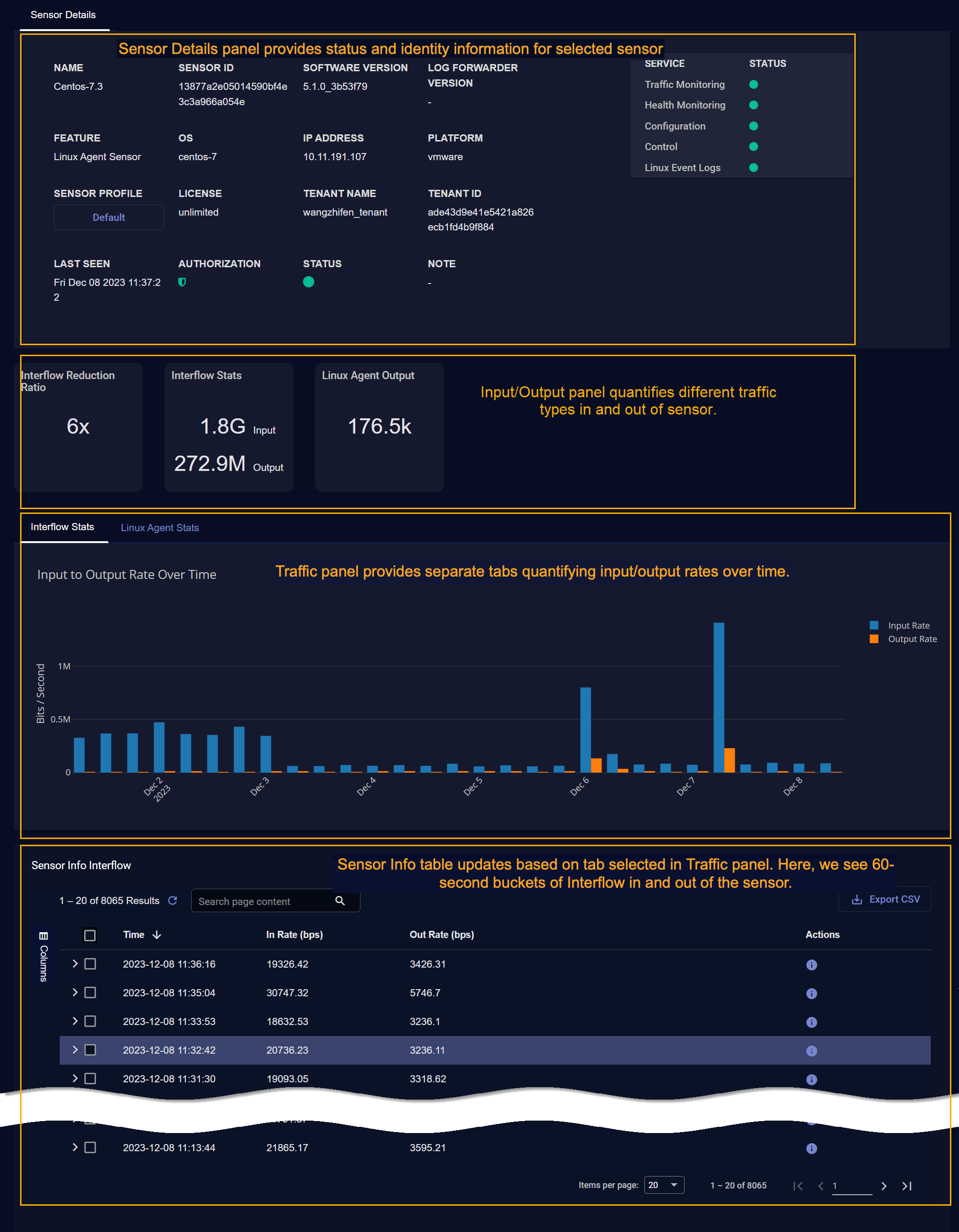 • Traffic Graphs show input and output rate over time for Interflow Reduction Ratio and Interflow Stats in separate tabs. Other additional tabs appear depending on the sensor type and the features enabled in its sensor profile.