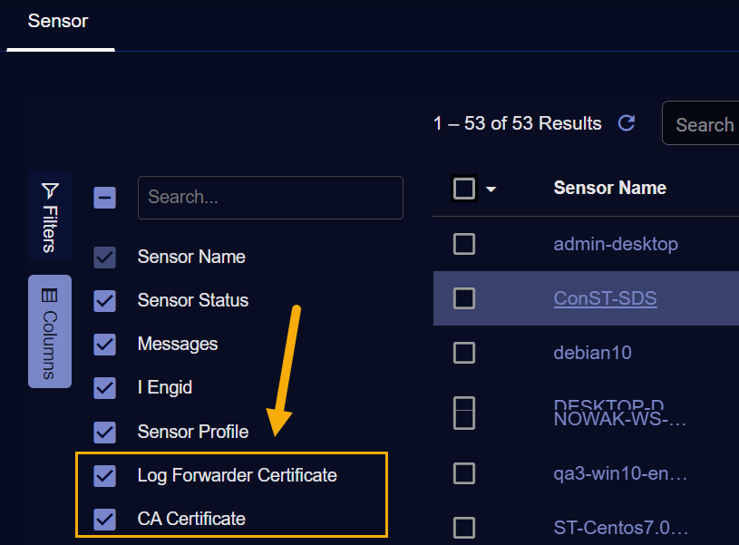 Start by adding a column to the Sensor List of the type corresponding to the type of certificate you want to remove. Click the Columns entry at the left of the table and select one or both of the following, as illustrated below:
