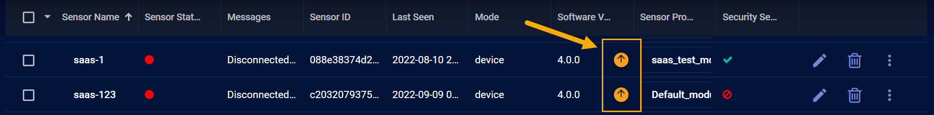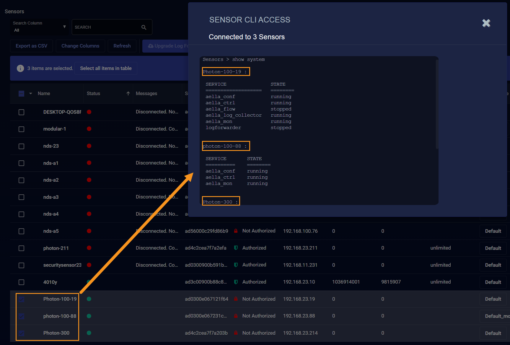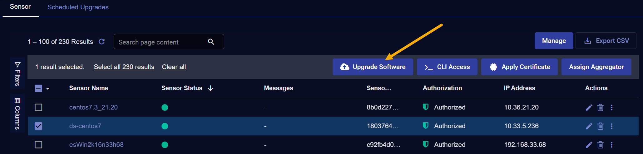 [ ] Check box to select sensors to Upgrade, open CLI Access, or Manage. Buttons for these features appear above the table appear when one or more sensors are selected.