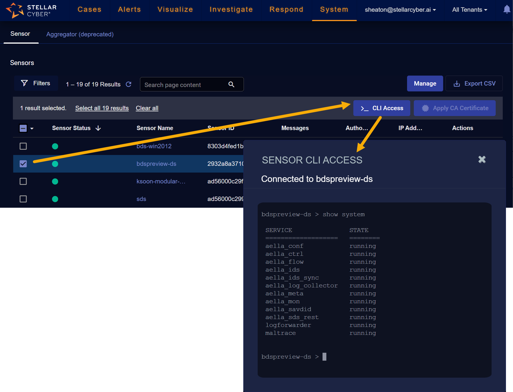 The System | Sensors page provides a list of all known sensors that are connected to the Stellar Cyber Platform.