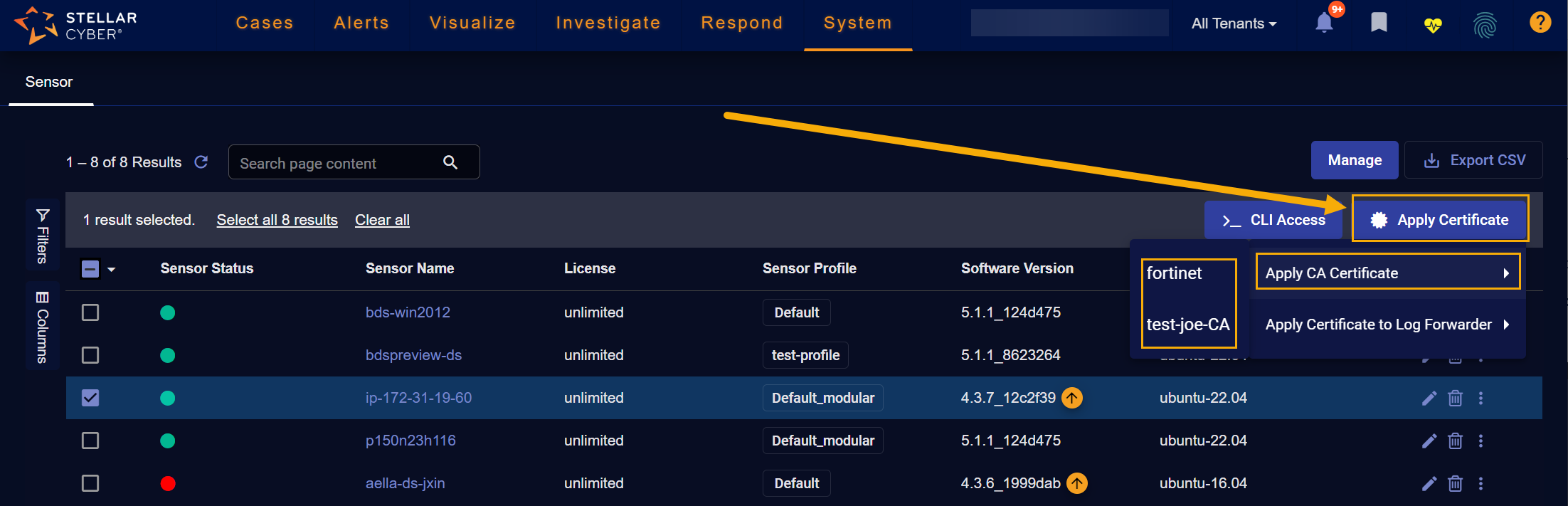 You can select one or more sensors in the Sensor Overview table and click the Apply Certificate | Apply CA Certificate button to assign a CA certificate to them. In response, a dropdown appears listing the CA certificates you've added to Stellar Cyber in System | Certificates that match the selected sensor's tenant, allowing you to click the one you want to apply.
