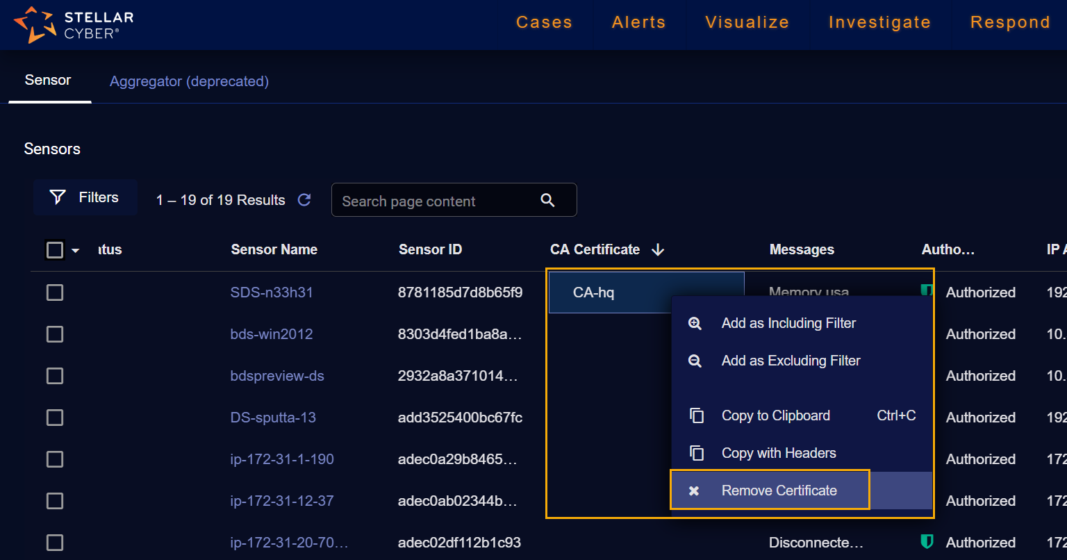 Locate the sensor whose certificate you want to remove and right-click its entry in either the Log Forwarder Certificate or CA Certificate column. Then, select the Remove Certificate option from the context menu that appears, as illustrated below. Keep in mind that you must remove all associations from a certificate before you can delete it in System | Certificates.