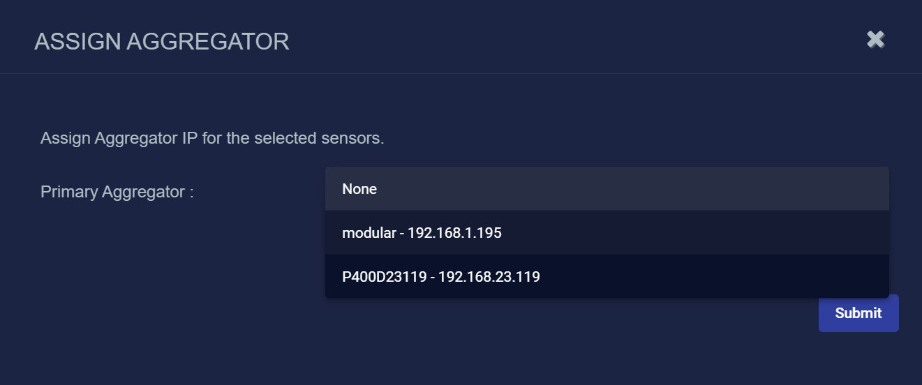 Use the Primary Aggregator dropdown to select the primary aggregator for the selected sensors. The dropdown lists all available aggregators for the tenant to which the sensors belong.