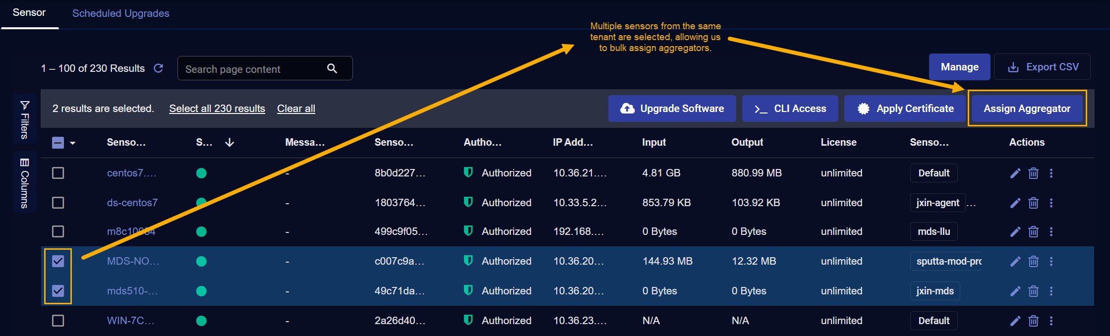 If you select multiple sensors, they must all belong to the same tenant in order to be able to perform a bulk aggregator assignment. If the Assign Aggregator button appears but is grayed out, you may have selected sensors from different tenants.