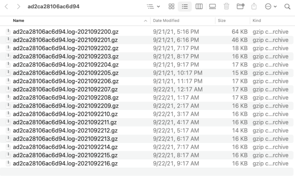 More options - Click this button to display a menu option to Download Debug Logs. Select this menu to download a gzip of the debug logs available for that sensor. The download is saved according to your browser settings for download files. The unpacked zip will appear similar to this example: