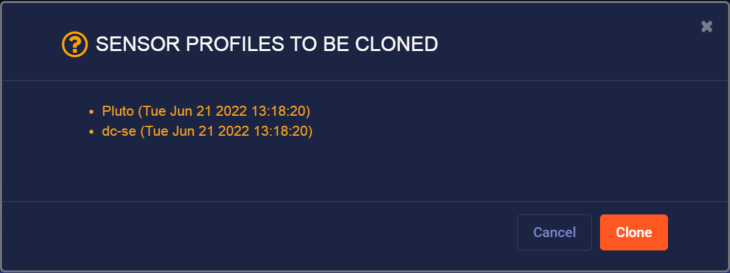 You can clone sensor profiles by checking their boxes in the Sensor Profiles list and clicking the Clone button. By default, cloned sensor profiles are given the same name as the source profile plus a timestamp indicating the time when the profile was cloned – for example, if you clone Pluto, it might become Pluto (Tue Jun 21 2022 13:12:24).