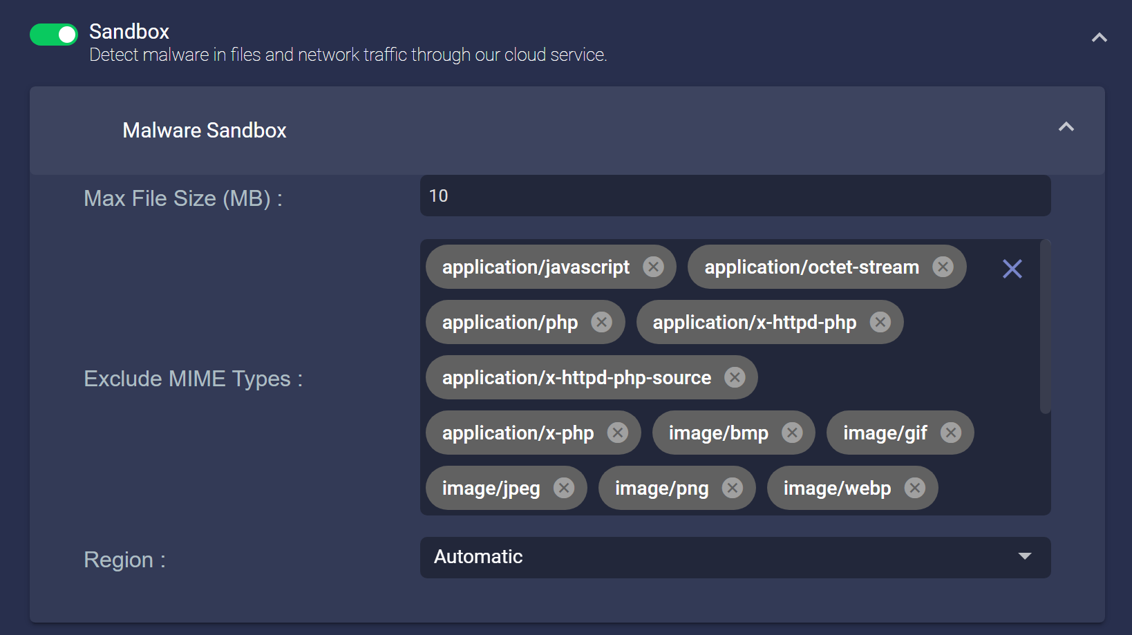 Region – Choose the geographical region of the malware sandbox used by this profile. By default, this option is set to Automatic and the sensor chooses the sandbox with the lowest latency relative to its own location. You can optionally override the Automatic option and choose a sandbox in a specific geographic location from the drop-down list.
