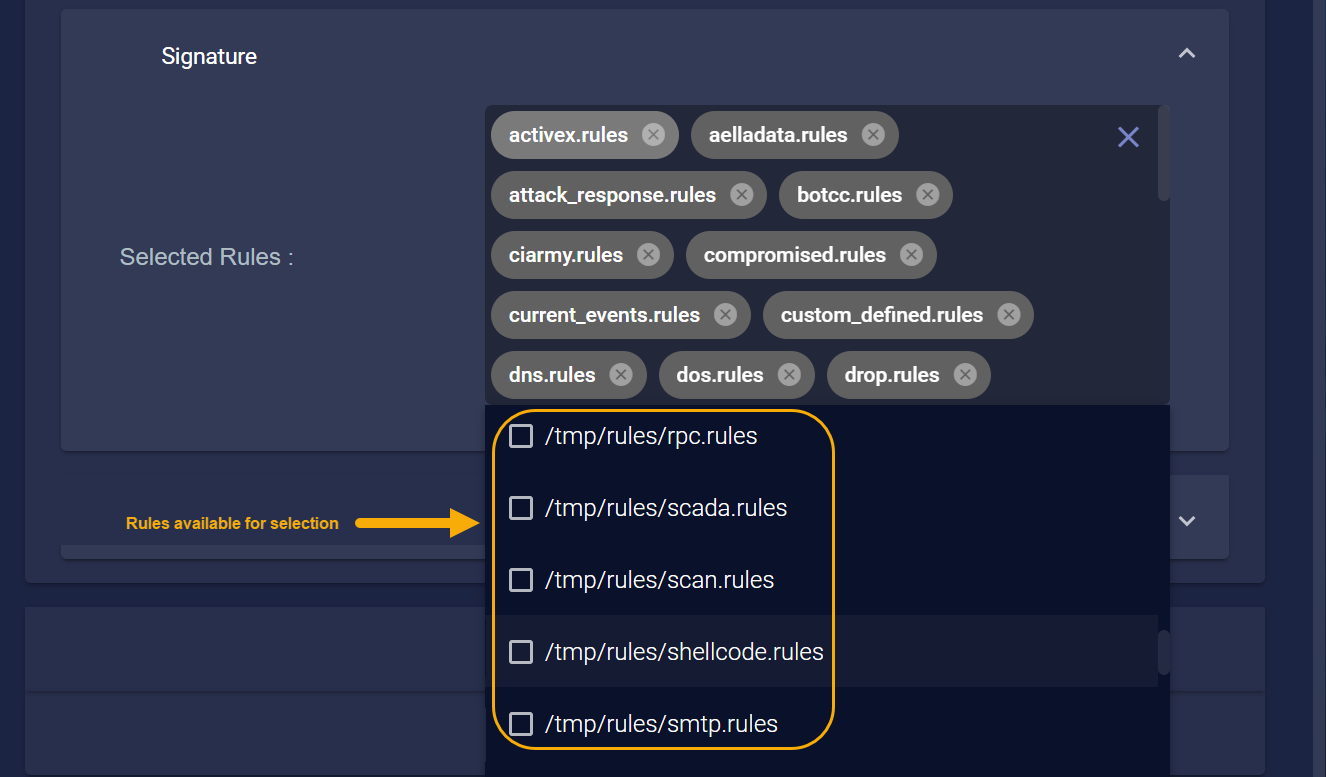 Stellar Cyber regularly pushes new rule sets so that they are available for selection in a sensor profile. Click at the bottom of the Selected Rules list to see a dropdown of the rules available for selection. For example: