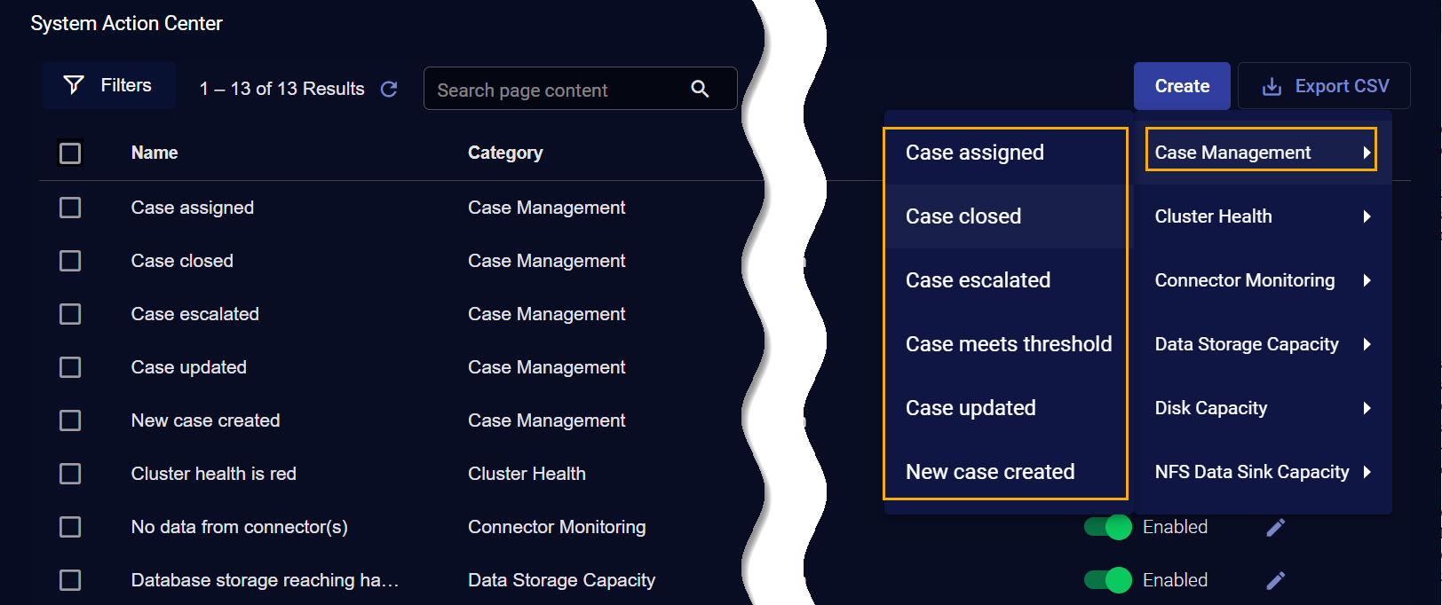 • Case Management – Get notifications when cases are assigned, closed, escalated, created, updated, or have a score that meets or exceeds a specified threshold.