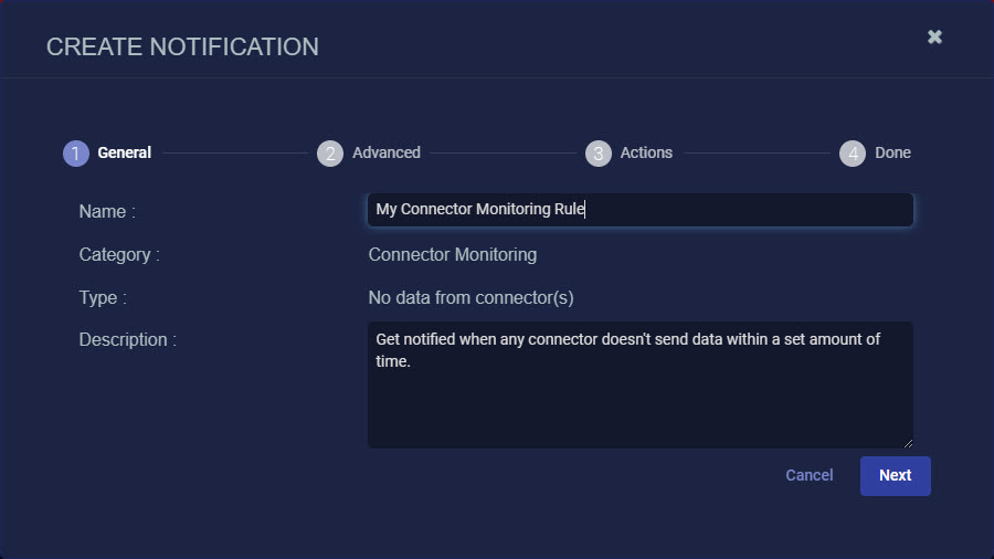 • Connector Monitoring – Get notifications when specified connectors haven't sent data over a given time interval so you can address issues in real time.