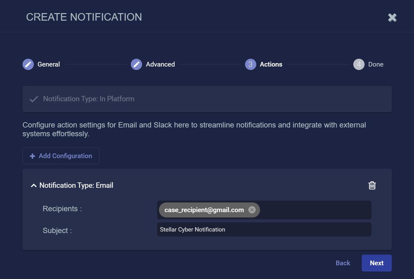 Email and Slack messages both include a summary of the event that triggered the notification and a link back to the Stellar Cyber platform to a location that makes sense based on the type of notification that was generated. You can configure a rule with any combination of email and Slack messages, including multiple destinations.