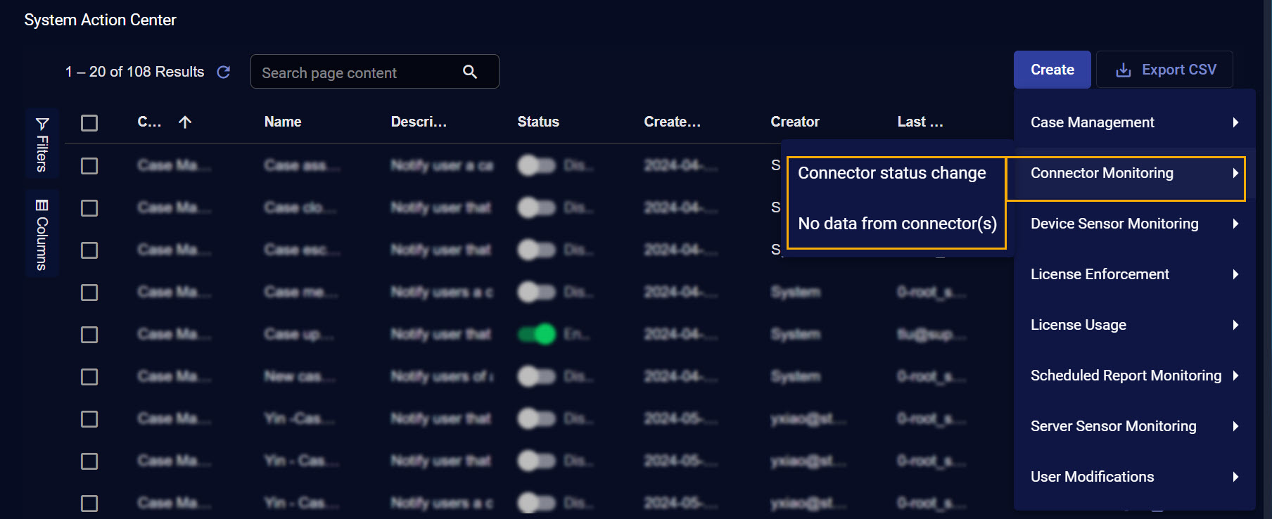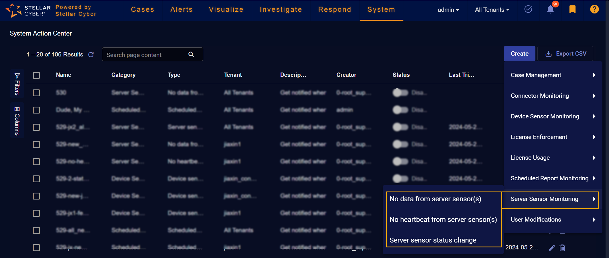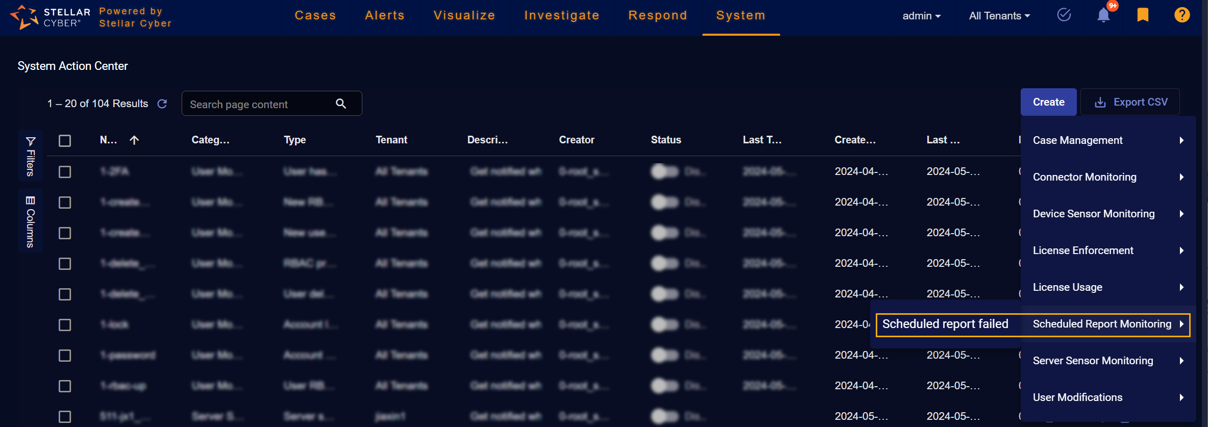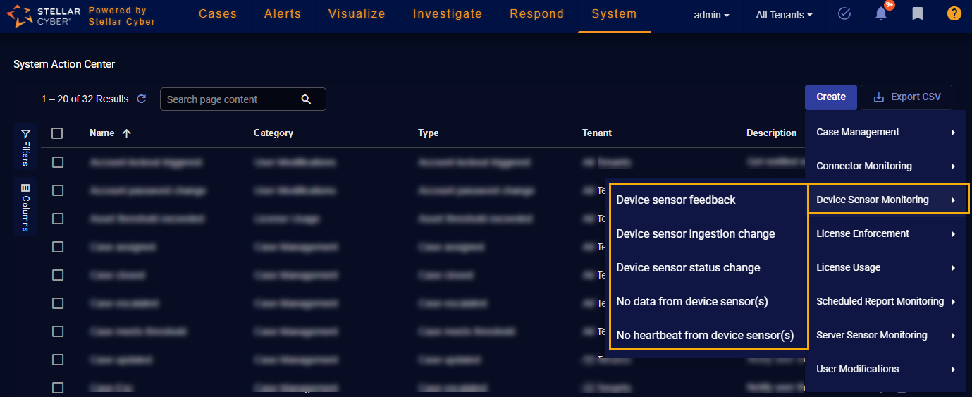 In addition, the System Action Center supports standard Stellar Cyber table functionality: