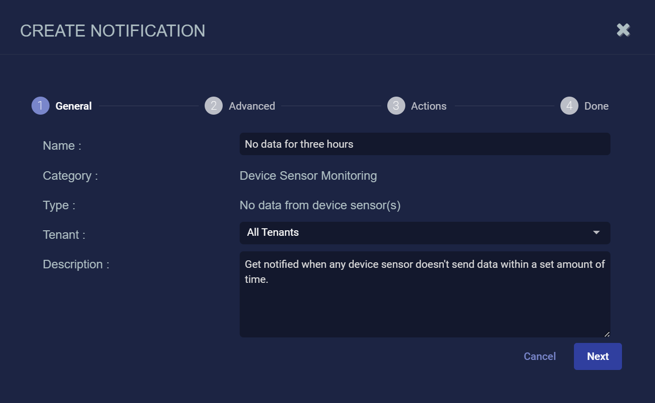 Device Sensor Monitoring No heartbeat from device sensor(s) Get notified when any device sensor doesn't send heartbeat within a set amount of time. Disabled