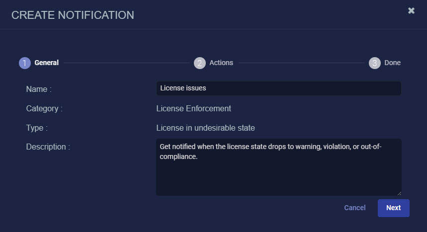 License Enforcement License in undesirable state Get notified when the license state drops to warning violation or out-of-compliance. Enabled