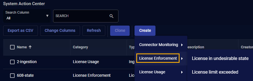 You create a new system notification rule by clicking the Create button at the top of the System Action Center, selecting the category and type of rule you want to create from the menu that appears, and following the wizard's prompts. Alternatively, if you want to use an existing rule as a template for a new one, you can check the box for the source rule in the list and click the Clone button to create an editable copy.