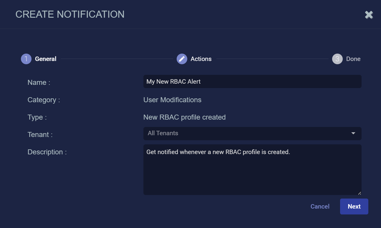User Modifications New RBAC profile created Get notified whenever a new RBAC profile is created. Disabled