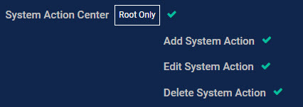 The System Action Center is only available to accounts with both Root scope and the System | System Action Center privilege assigned to their profile in System | Role-Based Access Control. By default, this includes only the Super Admin role. The necessary privileges in the Role-Based Access Control page are shown below: