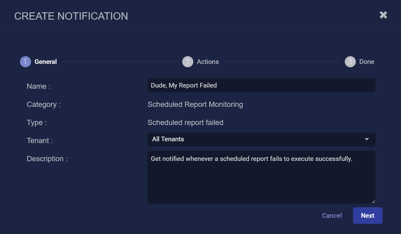 Scheduled Report Monitoring Scheduled report failed Get notified whenever a scheduled report fails to execute successfully. Disabled