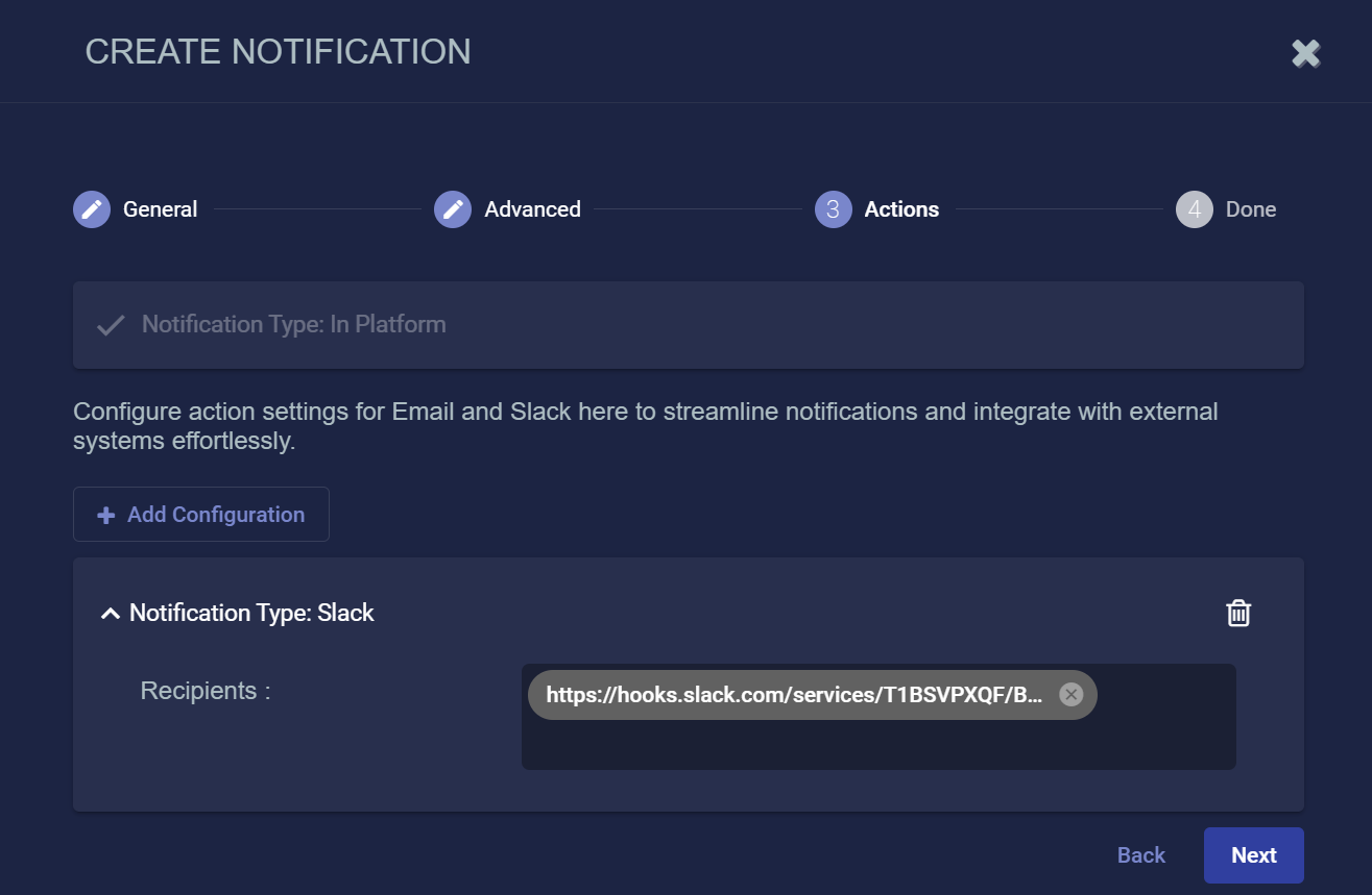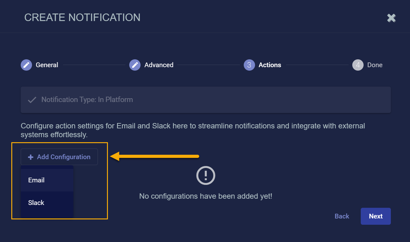 • Click the Add Configuration button and choose whether to add an Email or Slack action, as illustrated below.