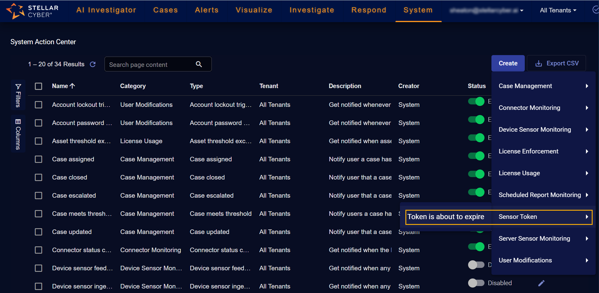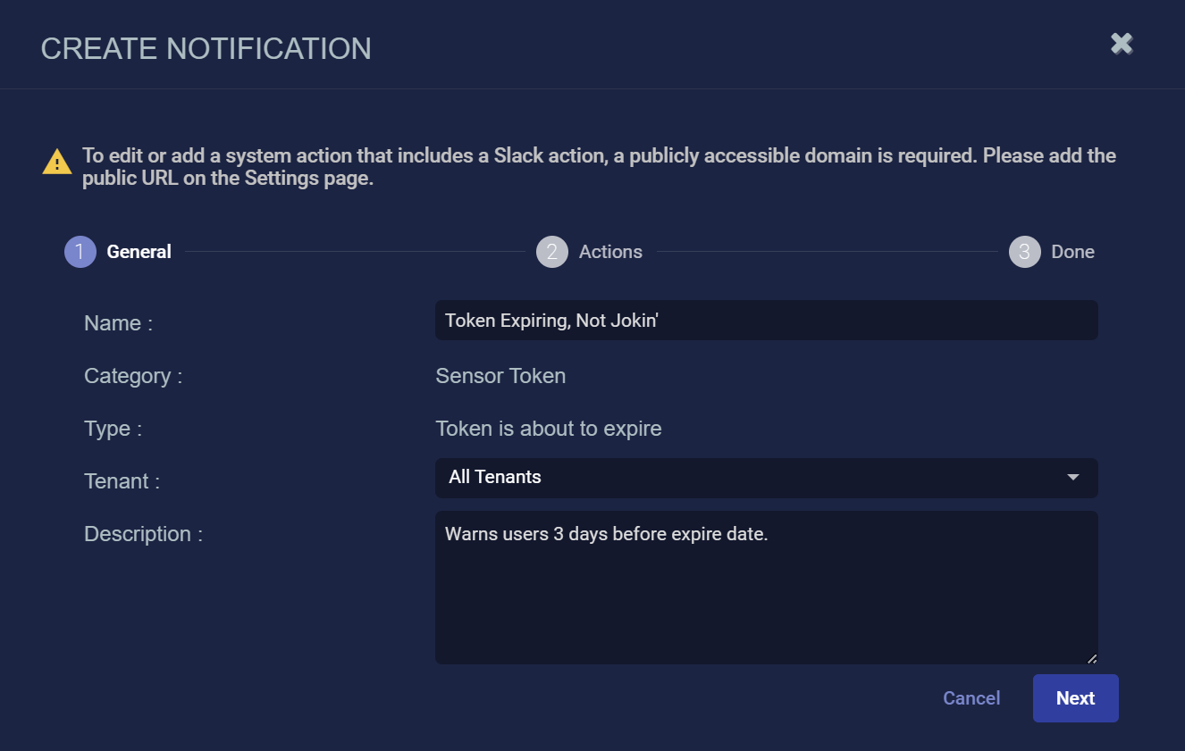 • Sensor Token – Get notified when a token used to authorize sensors is about to expire.