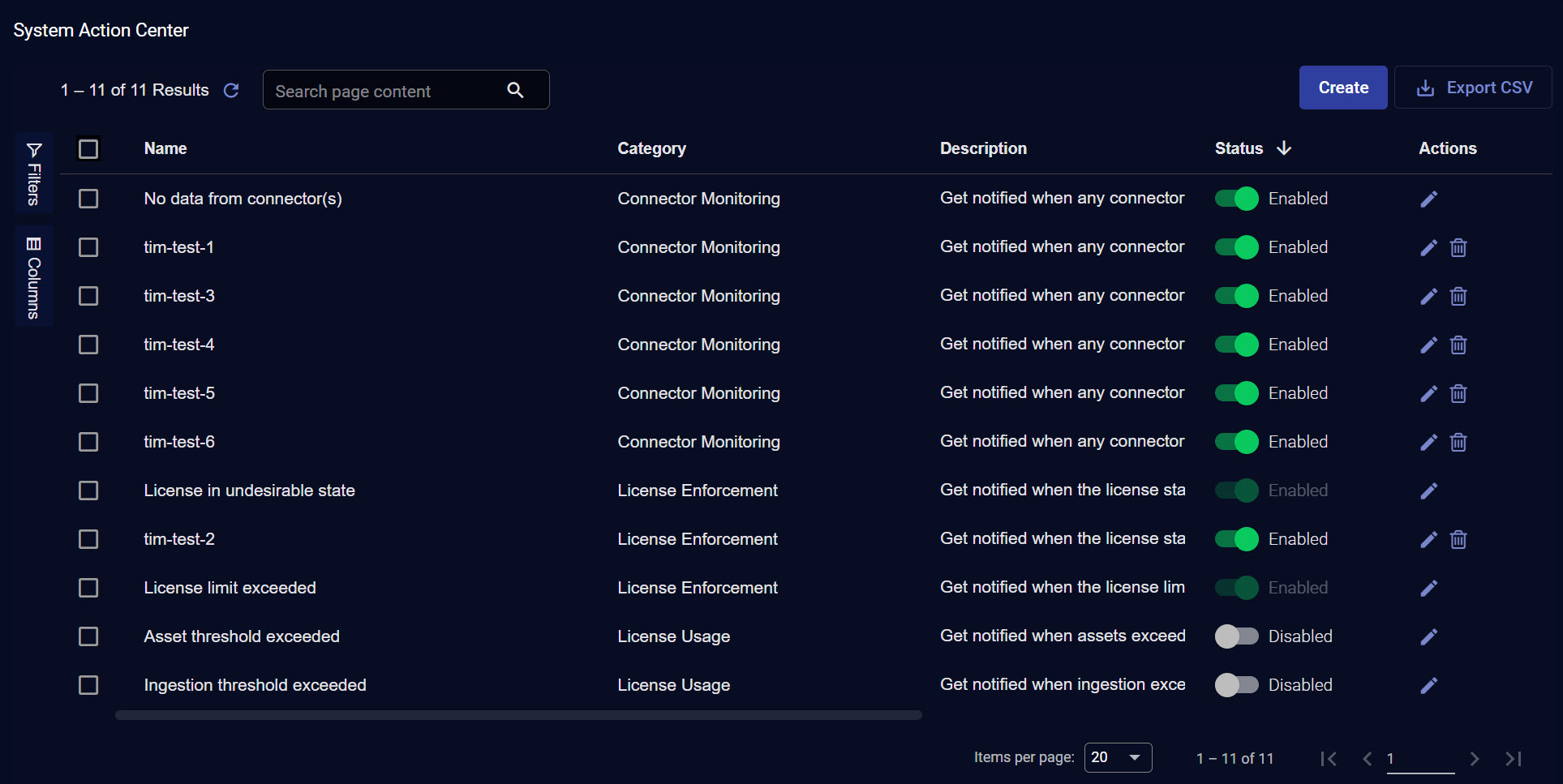 The System Action Center lists each of the defined system action rules in a standard Stellar Cyber table, as shown below.