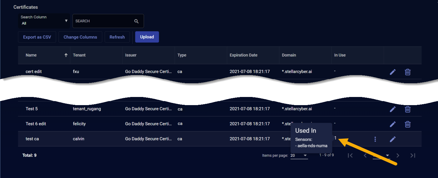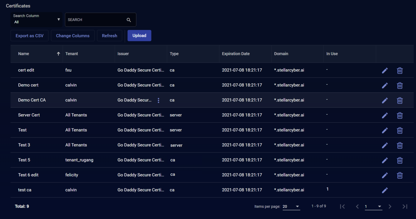 The System | Certificates page provides a centralized location to manage both Server and CA certificates. From here, you can view, edit, or delete existing certificates and upload new certificates. You can also see where an existing certificate is currently in use in Stellar Cyber.
