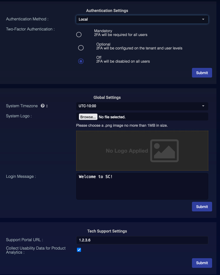 Use the System | Settings page to manage global settings for Stellar Cyber. You can make changes in each section independently; each section has its own Submit button. You can also make changes per tenant. Tenant configurations take precedence over the global configuration.