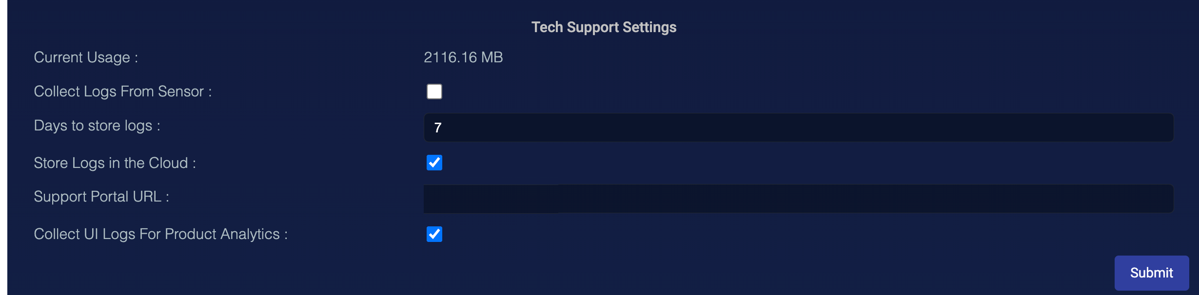 At the top you can see the current size of the tech support logs. You can configure:
