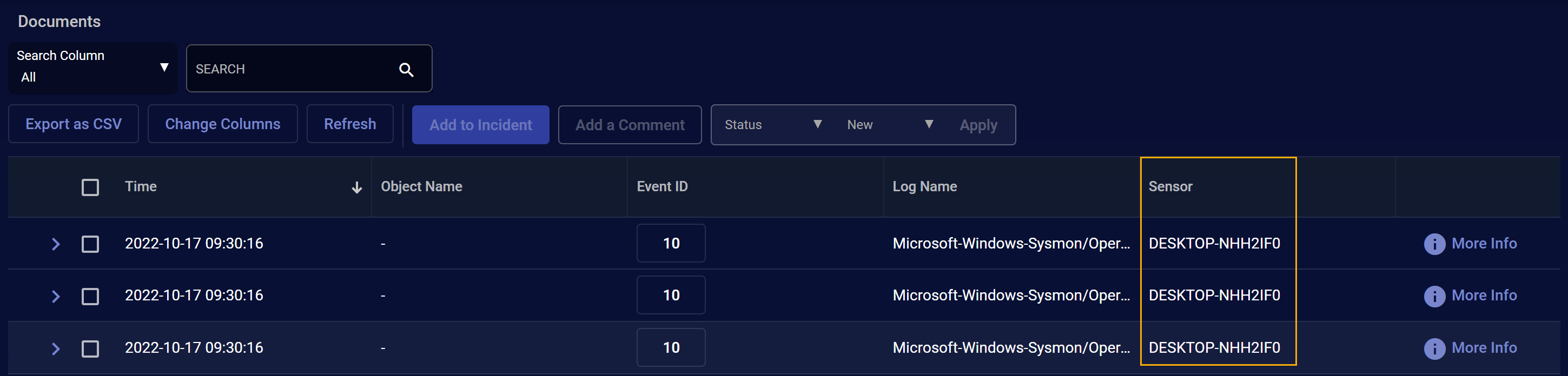 Sort by the Sensor column and scroll to the entries for the sensor you identified at the start of this procedure to verify that it passes the Sysmon filter. For example: