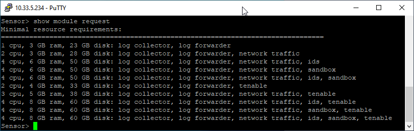 • The resources in the table were current at the time of writing. You can always see the most recent recommendations from Stellar Cyber by using the show module request command in the Sensor CLI. For example:
