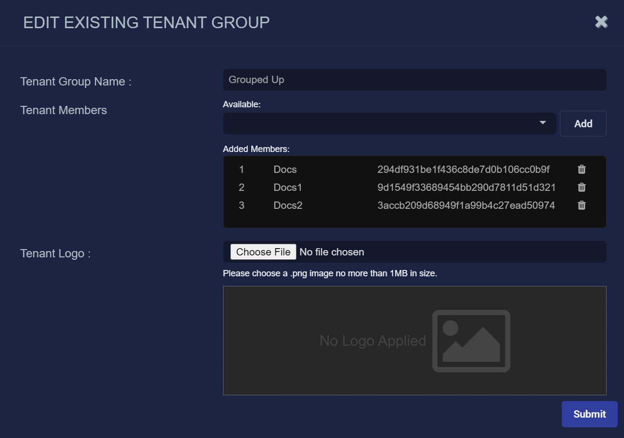 This section describes how update the settings for an existing tenant group. You can use a PATCH to the tenant groups API to change any of the configuration details available when creating a new tenant group in the user interface. The only mandatory fields are the Tenant ID and the Tenant Name (cust_name). The available fields are the same as described in Create a Tenant Group.