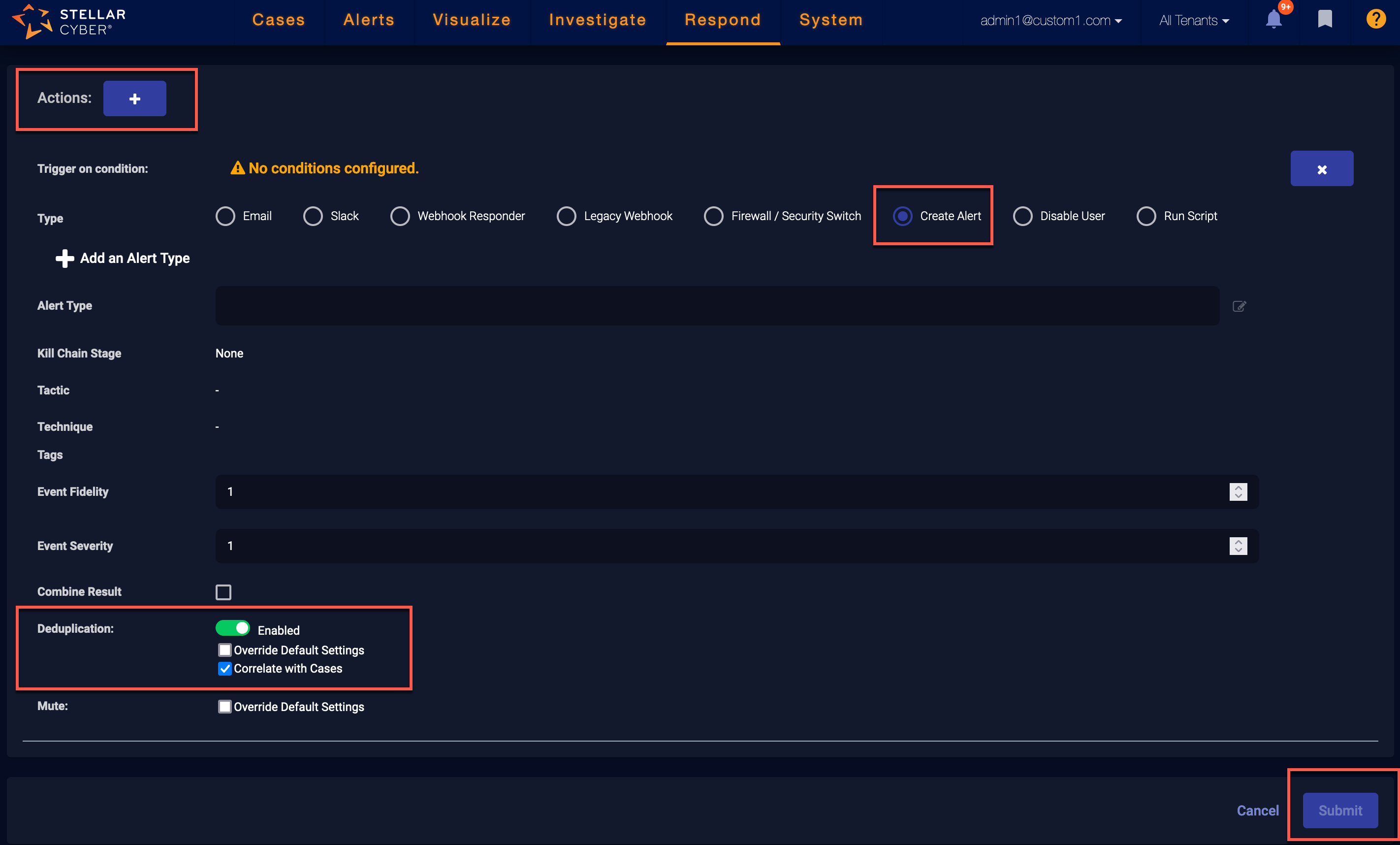To reduce noise and focus attention, Stellar Cyber automatically deduplicates multiple instances of the same custom alert if they fire within a small window of time (five minutes, by default). Stellar Cyber performs this deduplication by discarding fields that are always different between separate alerts, calculating a hash, and monitoring future events for matches.