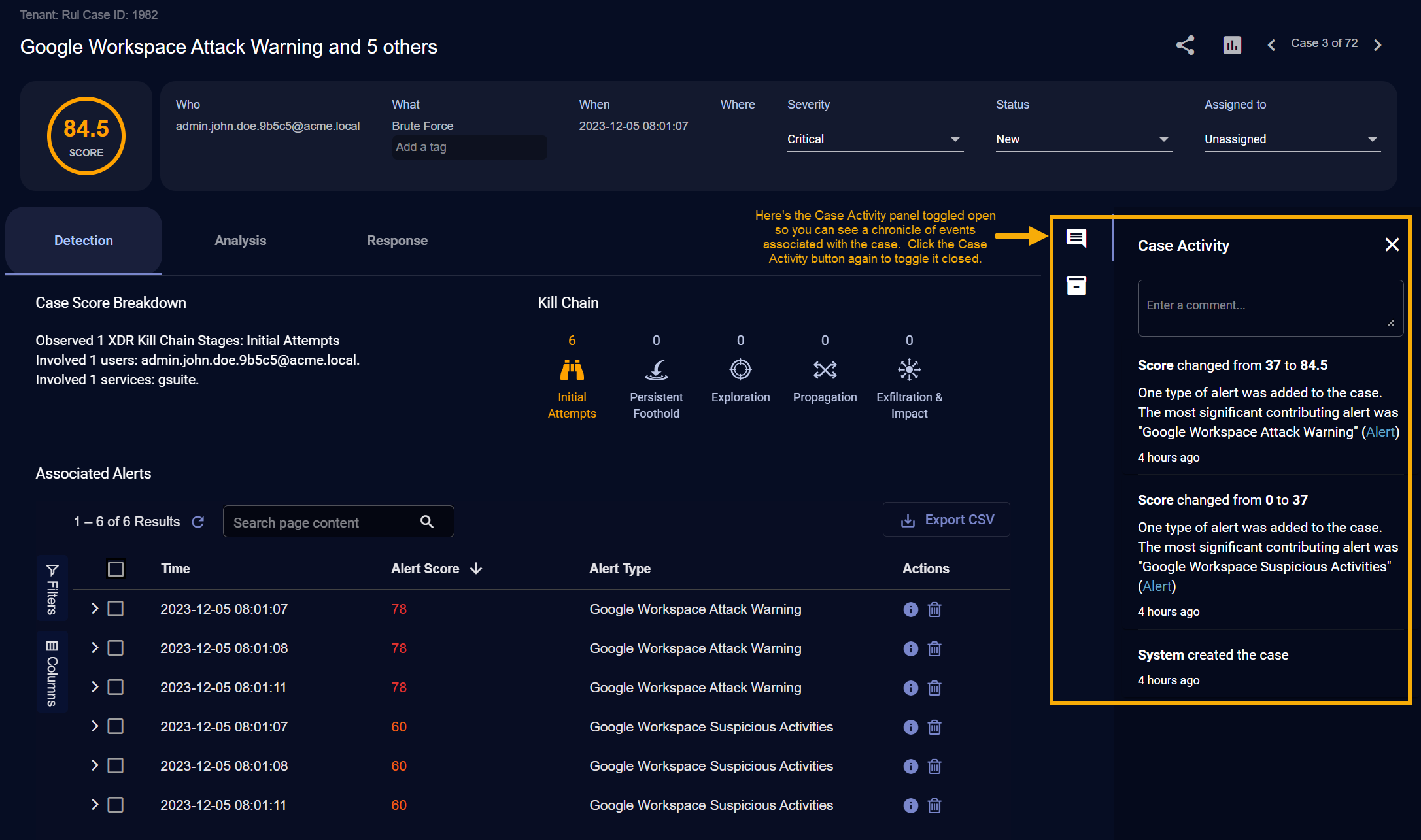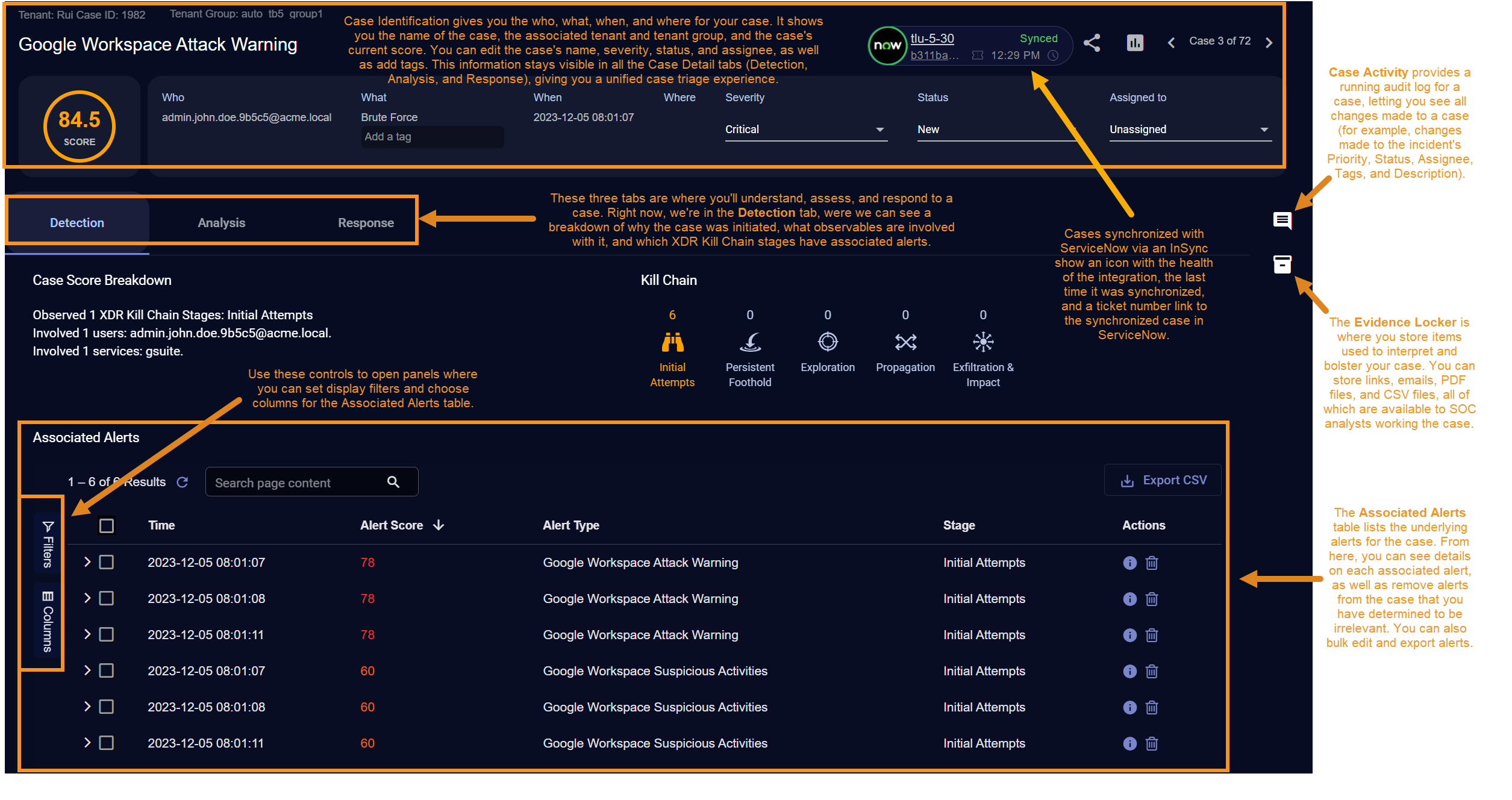 The figure below shows the Case Workspace with its default Detection tab, including the Associated Alerts table.